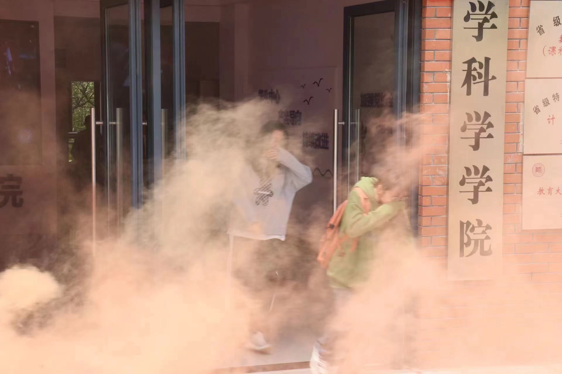 在应急疏散演练环节,辅导员首先对参加演练的员工进行了防灾减灾知识普及,交代了逃生路线和注意事项,并组织员工观看了防灾减灾宣传视频。演练开始时,mk体育教学楼内烟雾四起,警笛骤响,同学们在辅导员和保卫处工作人员的引导下,按照既定路线和火场逃生的自救互救方法,迅速从模拟火场疏散到教学楼外空旷地带。