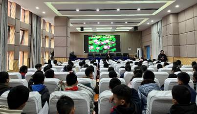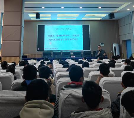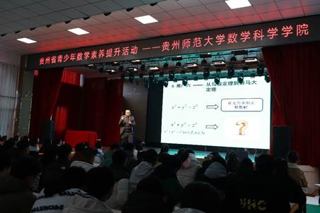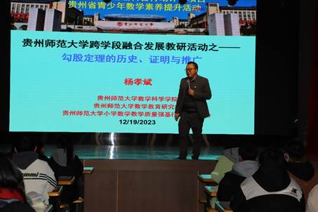 在黄果树民族中学和安顺三联公司(初中),杨教授首先向同学们介绍了勾股定理的历史,并告诉同学们现在世界上已找到勾股定理的证明方法有400余种,他鼓励同学们积极表达自己知道的证明方法。同学们纷纷举手,积极互动,顺着员工们的答案,杨教授讲述了“勾股定理几种特殊而优美的图证”和“勾股定理的推广”。最后他鼓励同学们:“勾股定理及其相关研究,是我国古代数学的重要课题之一,也是我们引以为豪的重要数学成就!传承中华优秀传统文化,学好、用好中国古代数学知识,是我们义不容辞的责任!”